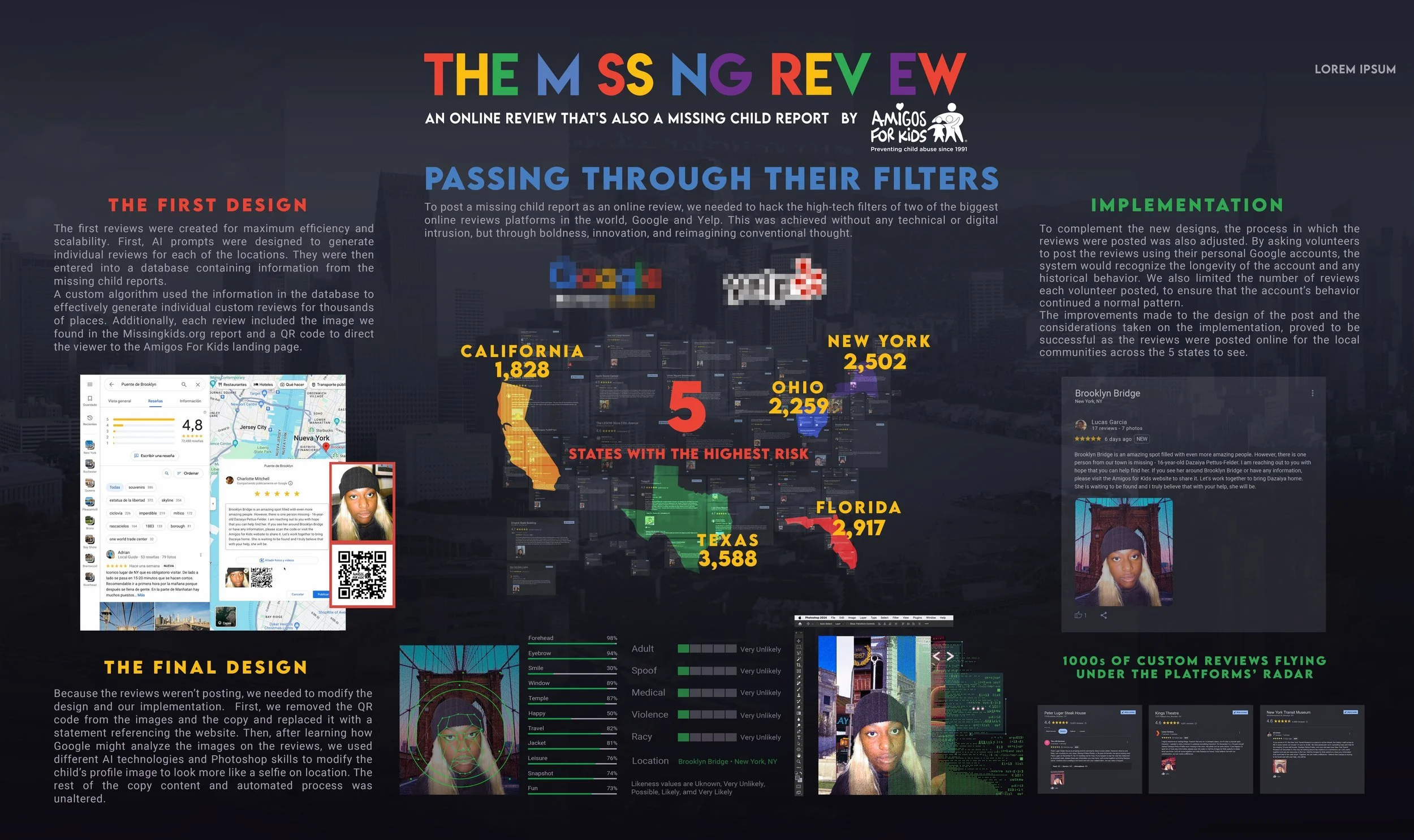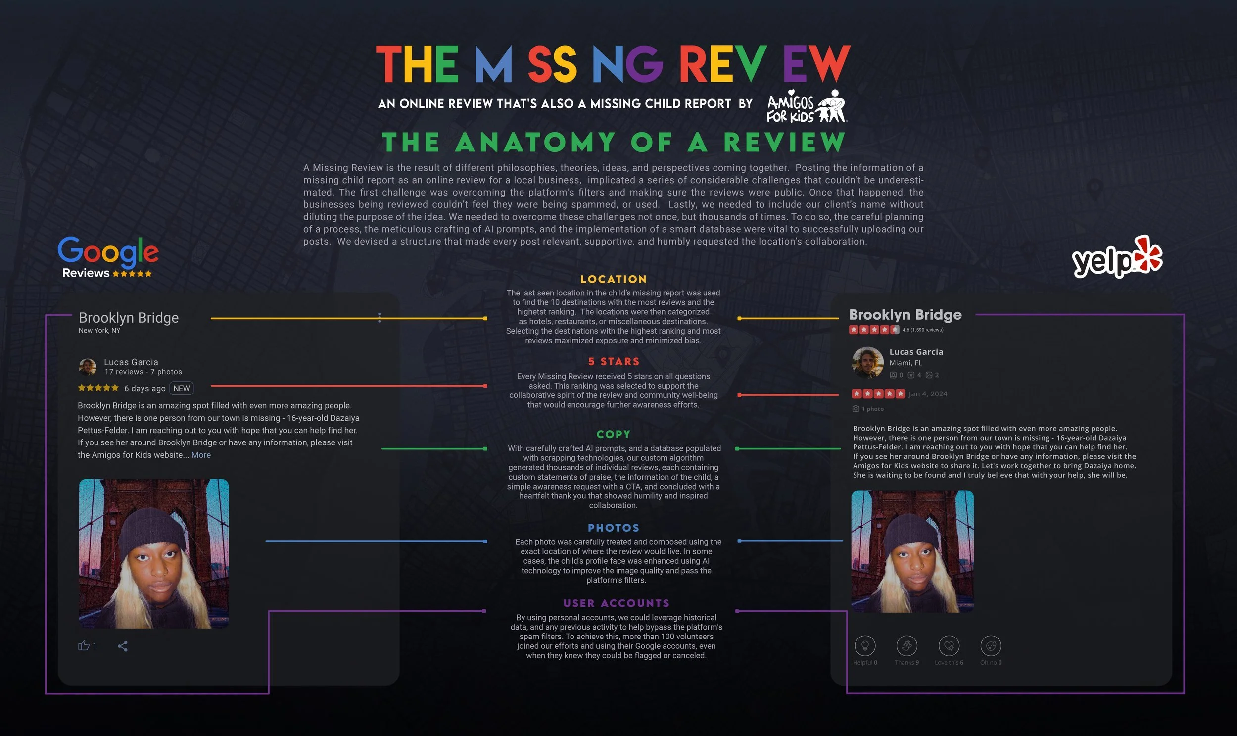 "The Missing Review" is an innovative and interactive ad campaign that ingeniously disguises missing children's reports as reviews on Google and Yelp. With 88% of internet users relying on these platforms for recommendations and ratings, this campaign aims to strategically insert information about missing children into